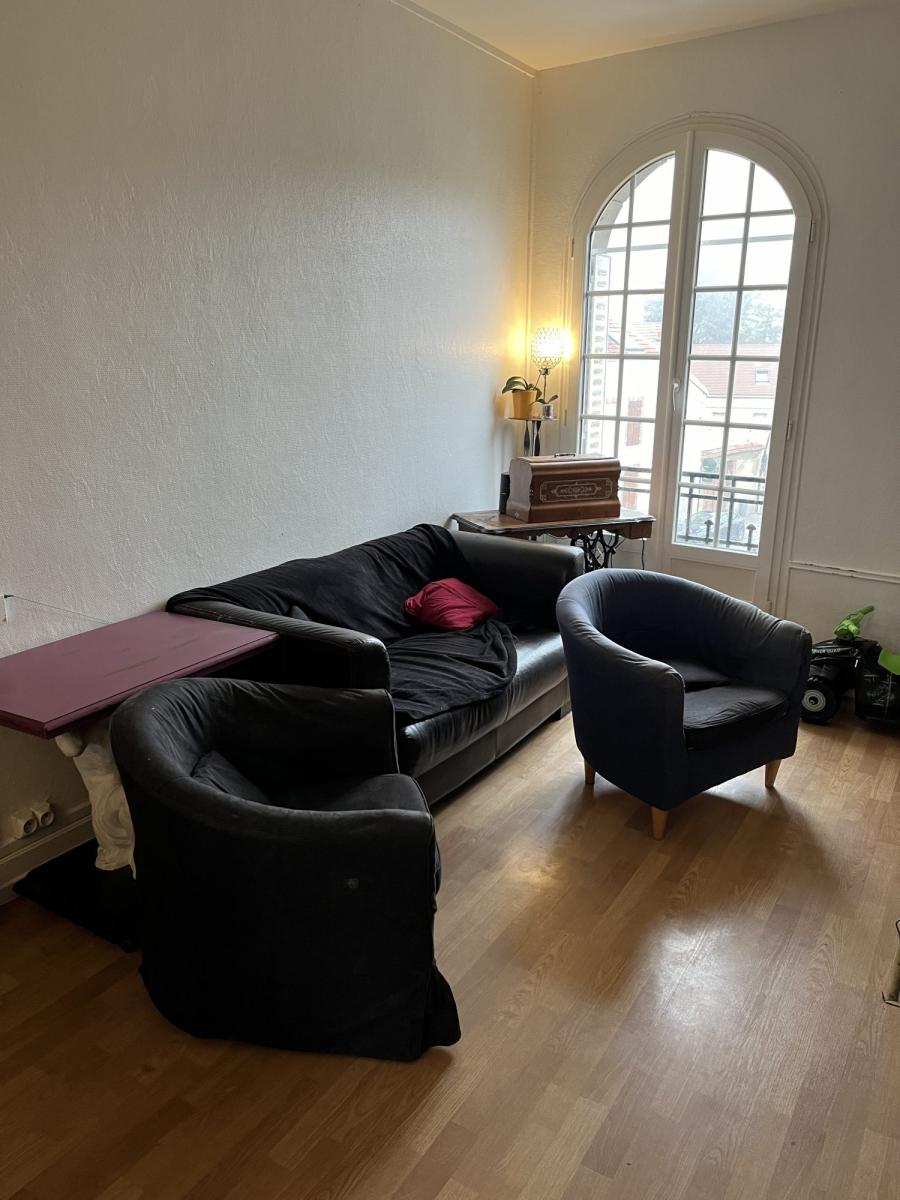Dans un immeuble ancien et proche du centre-ville, appartement duplex, comprenant : Entrée, cuisine ouverte sur séjour, salle de bains, WC, chambre. Au niveau supérieur : une chambre. Pièce complémentaire sur le palier. Grenier et cave. Copropriété de 18 lots. Charges de copropriété : 288 euros/trim