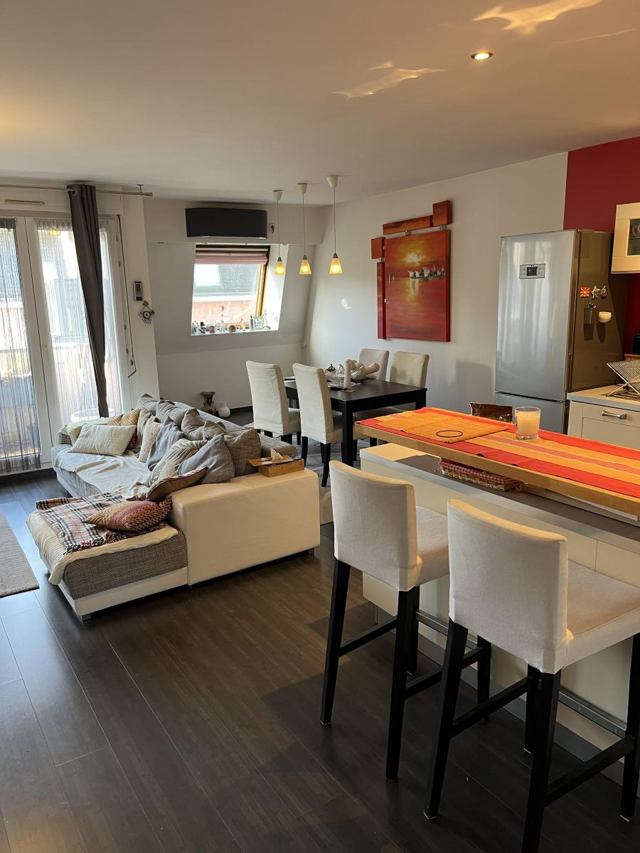 Dans une résidence proche du centre-ville, appartement T3 en très bon état général, comp : Entrée, cuisine ouverte sur séjour-salle à manger donnant sur balcon, WC, dégagement, salle de bains, deux chambres. Cellier et emplacement de stationnement. Copropriété de 44 lots. Charges de copropriété : 305 euros/trim (eau compris).